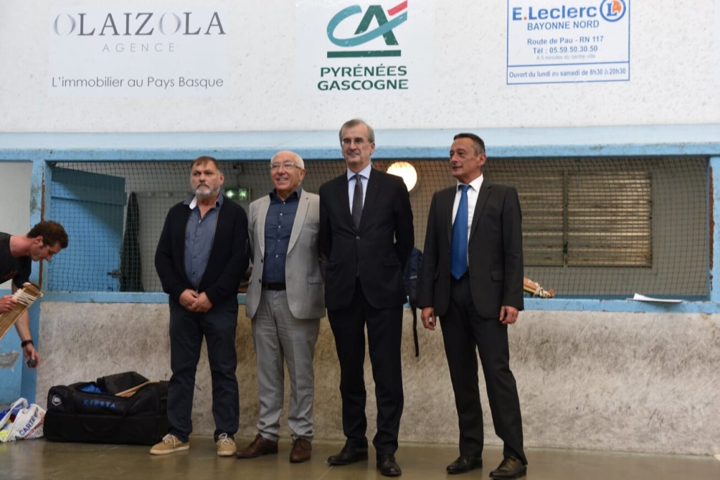 Venue du Gouverneur de la Banque de France (donatrice pour le Handipelote) accompagné du Maire de Bayonne au trinquet Louis Etcheto le 19/10/2018.