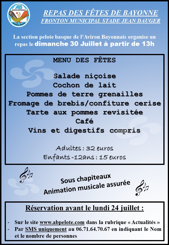 À l’occasion des fêtes de Bayonne, l’Aviron Bayonnais Pelote Basque organise un repas au fronton municipal du stade Jean Dauger le dimanche 30 juillet à partir de 13h.