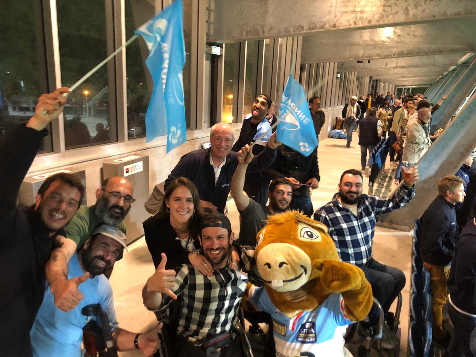 Jeudi 12 mai, à l’occasion du dernier match de la saison régulière de rugby ProD2 contre Rouen, au stade Jean-Dauger, notre section a participé à l’animation d’avant-match sur le thème du handicap. En collaboration avec le Fonds de Dotation du rugby pro, nous avons organisé une démonstration de handipelote, à 18 h, avec les meilleurs joueurs du moment au fronton Jean-Dauger : Benat LIZASO et German ELKORO, les champions mur-à-gauche de la discipline qui avaient fait le déplacement depuis Hegoalde, et nos deux champions bayonnais Yann MEUNIER et Max CABANNE, les spécialistes du trinquet. Après l’effort, les joueurs sont venus au stade encourager les Ciel et Blanc depuis les tribunes grâce aux invitations de l’AB Rugby Pro et, apparemment, ils se sont bien fondus dans l’ambiance.