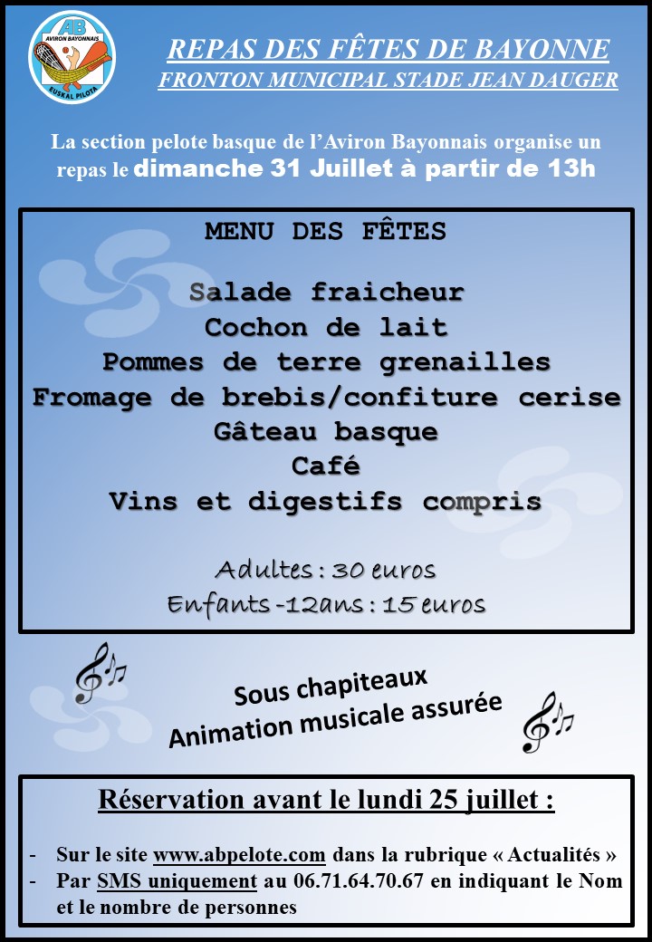 À l’occasion des fêtes de Bayonne, l’Aviron Bayonnais Pelote Basque organise un repas au fronton municipal du stade Jean Dauger le dimanche 31 juillet à partir de 13h.