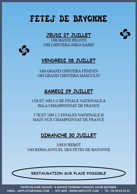 Catégories ACTUALITES Programme Fêtes de Bayonne 2017 Auteur de l’article Par Beñat HAROSTEGUY Date de l’article 9 juillet 2017 ← Pelote Basque pour Tous / Euskal Pilota Denentzat → Repas dimanche Fêtes de Bayonne 2017